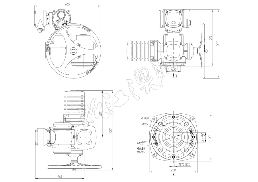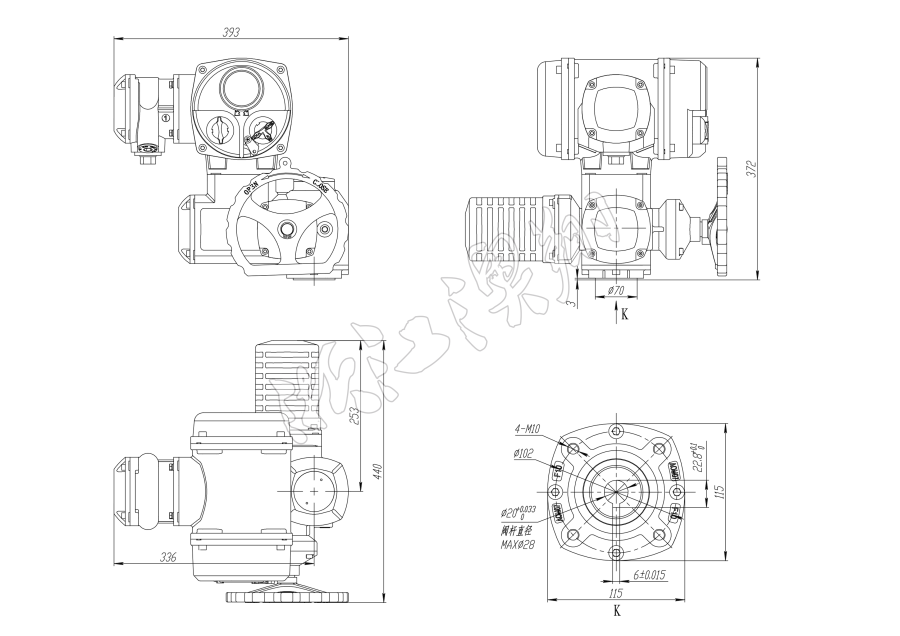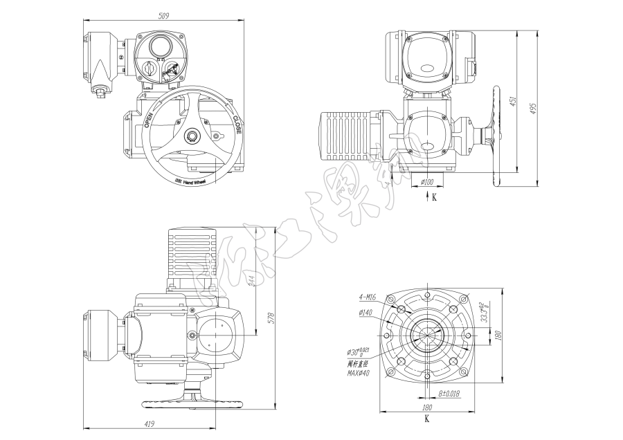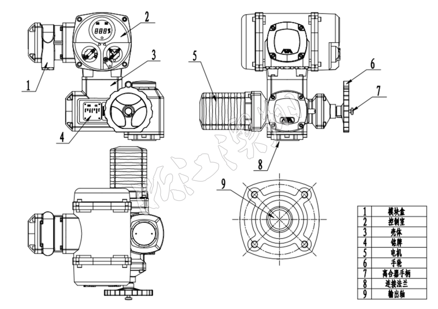 底部安裝尺寸符合ISO5210標準,驅動軸套可拆下根據需要進行加工,兼容性好。可以垂直安裝,也可以水平安裝。