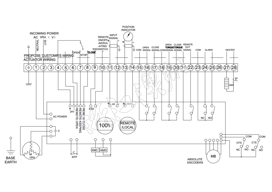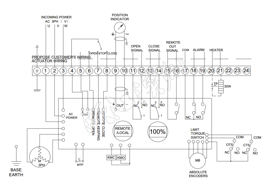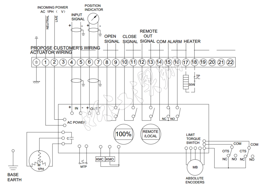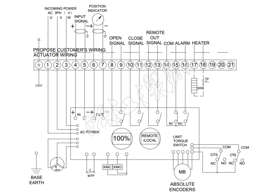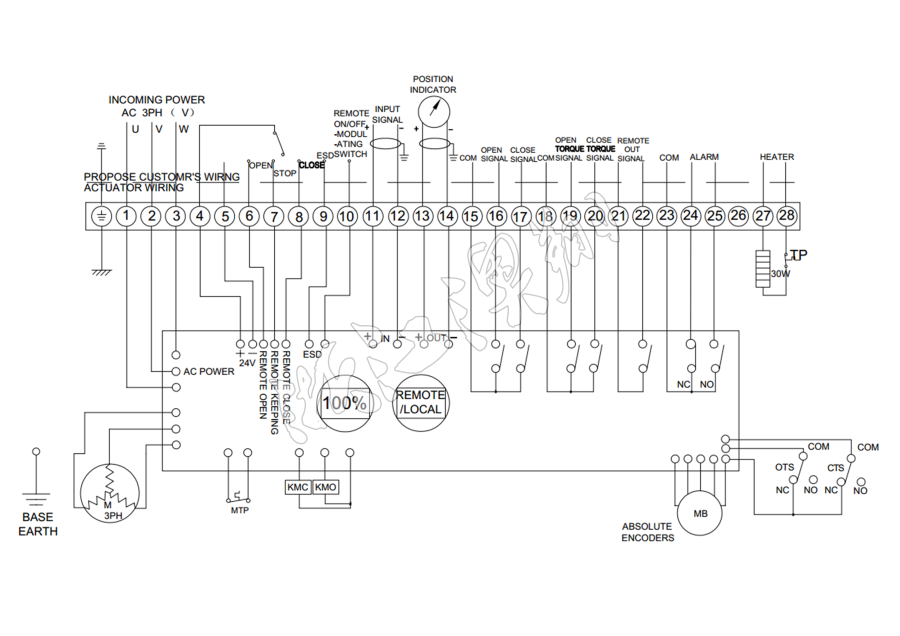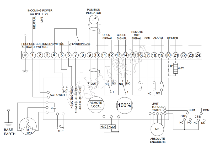 控制線路符合單相或三相電源標準,線路布置緊湊合理。執行器采用葵花端子配置29個接線端口,雙密封連接時端子臺安裝于執行器腔體和連接器之間。即使在取下外蓋后或是電纜封套沒有完全密封的情況下,也可保護設備免于塵土或濕氣的侵害。接線端子可有Xiao滿足各種附加功能的要求。(可根據客戶要求另行加工)